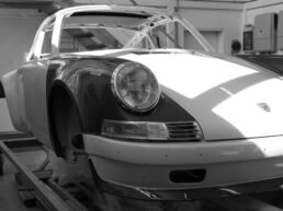 Damit war sozusagen der Geist aus der Flasche und unser Ehrgeiz geweckt: Uns wurde klar, wir würden Gene des luftgekühlten 993 mit der Optik eines F-Modells vereinigen, einem der schönsten Sportwagen, die je gebaut wurden. Die perfekte Technik im perfekt nostalgischen Look. Wir nahmen die Herausforderung an und wussten, dass wir nun virtuos sein mussten auf der gesamten Klaviatur des Karosseriehandwerks. Entsprechend aufwändig gestaltete sich das Vermessen, Umrechnen, Skalieren und Herantasten an den perfekten, authentischen Look.
